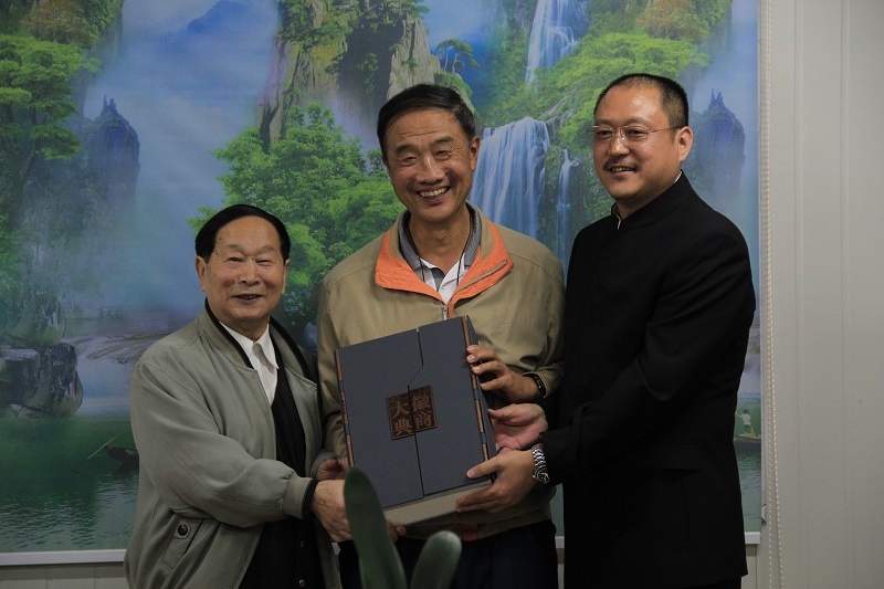 中国人民解放军总装备部科技委原副主任、徐向前元帅之子徐小岩中将(中),世界徽商论坛永久会址高级顾问张脉贤(左),黄山五福置业有限公司董事长孙永林(右)